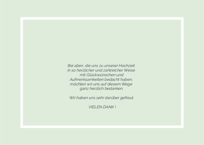 Ihr Hochzeitstag wäre nicht derselbe gewesen ohne die Teilnahme und Unterstützung Ihrer Freunde und Familie. Senden Sie ihnen eine personalisierte Dankeskarte zur Hochzeit. Personalisieren Sie ganz einfach Ihre Dankeskarten zur Hochzeit und machen Sie sie wirklich zu etwas Besonderem. Fügen Sie ohne Aufpreis Fotos und Texte zu jeder Seite der Optimalprint-Karte hinzu.