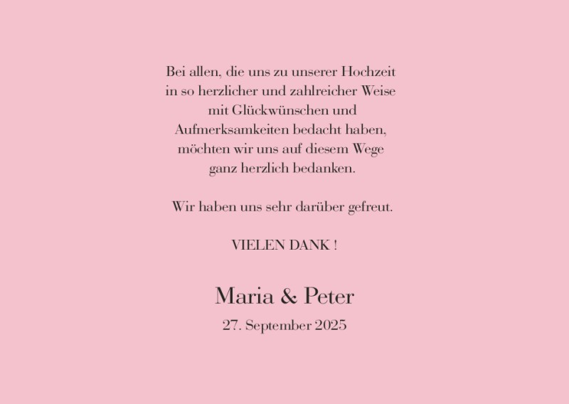 Diese Dankeskarte Hochzeit hat ein modern Design in rosa Tönen. Dieses charmante Design beinhaltet ebenfalls Rahmen und Fotos.