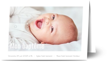 Les faire-part de baptême classiques, avec détails, texte et images sont absolument parfaits pour créer un souvenir spécial de ce jour unique. Le moment venu de faire baptiser votre tout petit, le choix d'un faire-part de baptême peut s'avérer difficile. Optez pour un faire-part de baptême classique parfaitement intime. Nous proposons différents modèles d’invitations de baptême parmi lesquels choisir, contenant tous du texte et des zones de photo, permettant de créer très facilement des faire-part de baptême classiques avec une touche personnelle. Vous ne trouvez pas les mots ? Nos modèles d'invitations de baptême contiennent du texte pour vous éviter d'oublier un détail important. Vous êtes en veine d'inspiration et souhaitez un texte spécial ou un psaume particulier ? Aucun problème. Vous pouvez modifier et ajouter des zones de texte à votre faire-part de baptême pour inclure les informations et le texte de votre choix. Il vous faut des cartes de localisation ou d'information supplémentaires ? Si vous n'avez pas assez de place sur une carte recto-verso pliée, pourquoi ne pas créer des cartes d'accès personnalisées ou RSVP assorties à vos faire-part de baptême classiques ? Quelle que soit votre décision, nous imprimons votre commande personnalisée sur un support de qualité afin que vos faire-part offrent le meilleur aspect d'impression.