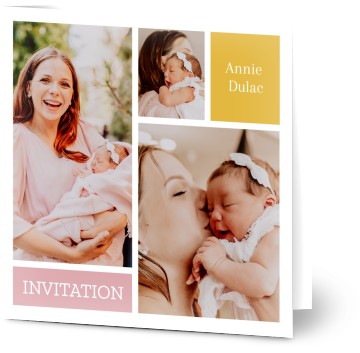 Lorsque votre tout petit est prêt pour son baptême, apportez une touche spéciale à vos invitations grâce à nos services d'impression. Nos impressions de qualité professionnelle assurent que vos images, photos et créations sont traitées comme elles le méritent pour créer des invitations de baptême qui deviendront des souvenirs. Que votre faire-part de baptême soit pour un garçon ou une fille, que vous souhaitiez un style classique ou contemporain, nous proposons les modèles de faire-part de baptême avec photo qu'il vous faut. Vous pouvez télécharger des photos de votre bébé, utiliser nos modèles et créer un souvenir spécial de ce jour avant qu'il n'arrive. Vous avez la certitude de trouver le modèle parfait parmi les dizaines d’invitations de baptême que nous proposons. Vous êtes en veine d'inspiration ? Retirez simplement les boîtes d'image ou de texte de votre choix, ajoutez-en de nouvelles et modifiez les tailles et tout ce que vous voulez. Tout est entièrement personnalisable ! Vous ne trouvez pas les mots ? Pas de problème. Si vous cherchez le texte parfait pour un faire-part de baptême (ou toute autre invitation), nous proposons des dizaines d'invitations de baptême avec un texte préétabli. Il suffit de changer les noms, les dates et les lieux en fonction de vos détails. Quelle que soit la méthode choisie, Optimalprint propose le modèle parfait pour vous aider à concevoir et créer votre propre faire-part de baptême avec photo.
