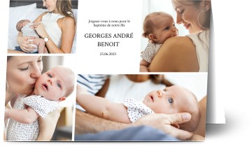 Nos faire-part de baptême avec la photo de votre fils ou votre fille rendent spéciale chaque invitation envoyée. Créer un faire-part de baptême avec photo revient à créer un souvenir spécial de l'un des événements les plus importants de la vie d'un bébé. Ne manquez pas de créer un résultat spécial que vous pourrez conserver à jamais en choisissant nos modèles personnalisés avec photo pour vos faire-part de baptême. Nous proposons des dizaines de modèles de faire-part de baptême afin que vous puissiez choisir celui qui vous convient. Votre choix effectué, vous pouvez utiliser notre disposition et télécharger des photos et du texte, ou créer un résultat totalement original avec votre propre disposition du texte et des images. S'il vous manque juste un petit peu d'inspiration, vous pouvez laisser une partie du modèle inchangée et déplacer ou modifier d'autres éléments. Nos faire-part de baptême avec photo sont entièrement personnalisables afin que vous puissiez créer la carte pour baptême parfaite qui sera conservée pendant des années comme un rappel spécial de l'événement. Quel que soit le type de personnalisation du faire-part de baptême avec photo que vous choisissez, vous savez que nous vous livrerons des cartes pour baptême de qualité. Nous utilisons des supports et de l'équipement d'impression de qualité afin que vos cartes présentent un aspect professionnel. Faites réaliser vos faire-part de baptême avec photo par une entreprise soucieuse de la qualité - Optimalprint France.