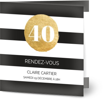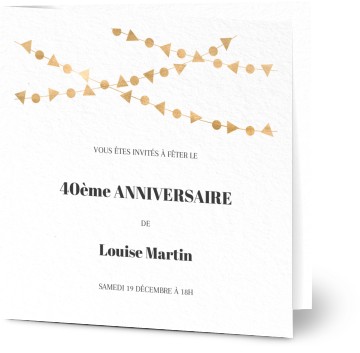 Invitations pour 40 ans - personnalisées et personnelles - Vous souhaitez des designs personnalisés pour des invitations pour les 40 ans de vos proches ? Chez Optimalprint, nous avons la solution qu'il vous faut. Vous avez planifié une grande fête d'anniversaire pour vos 40 ans ou pour une personne qui vous est chère ? Il ne vous manque plus que les meilleures invitations d'anniversaire pour 40 ans ! Chez Optimalprint, nous sommes là pour vous aider avec notre gamme d'invitations d'anniversaire pour 40 ans. Pour l'impression de vos invitations d'anniversaire, nous n'utilisons que du papier de qualité certifié pour son respect de l'environnement. De plus, notre site de production local vous garantit des délais de livraison rapides et des prix abordables ! Invitations pour 40 ans : Avoir 40 ans n'a jamais semblé aussi excitant ! Que vous souhaitiez organiser un anniversaire festif pour vos 40 ans, ou que vous souhaitiez rester plus discret, chez Optimalprint, nous avons tous les designs pour correspondre à votre style de vie ! Du monochrome aux images en passant par des messages amusants, vous pouvez compter sur nos invitations d'anniversaire pour 40 ans pour célébrer cette journée exceptionnelle. Voici quelques-uns de nos modèles les plus populaires : Grands chiffres : Faites savoir au monde entier que vous fêtez vos 40 ans avec enthousiasme grâce à nos invitations d'anniversaire pour 40 ans à grands chiffres. Choisissez parmi une collection de couleurs vives, d'arrière-plans et de libellés originaux pour imprimer des invitations d'anniversaire depuis votre domicile ou votre bureau. Moderne et minimaliste : Nos invitations modernes et minimalistes pour 40 ans se distinguent par des couleurs sobres, des polices de caractères élégantes et des dégradés raffinés. De plus, vous pouvez choisir entre des invitations d'anniversaire avec texte ou avec photo. Amusant : 40 ans, c'est fun, et nos invitations d'anniversaire pour 40 ans sont particulièrement originales ! Qu'il s'agisse d'un thème autour d'une cassette vintage ou d'une guitare enflammée pour la rockstar qui sommeille en vous, nous avons fait en sorte de vous donner l'embarras du choix dans cette catégorie. Vous pouvez également opter pour un thème barbecue ou bière pour que vos invités sachent à quoi s'attendre pendant la soirée (ou la journée !). Fleuri : Vous êtes à la recherche d'invitations pour ses 40 ans ? Que diriez-vous d'un thème floral ? Avec une gamme de motifs floraux blancs et colorés, vous trouverez celui qui correspond le mieux au thème de votre fête. Bien entendu, nos invitations florales pour 40 ans peuvent s'adapter au thème d'une fête d'anniversaire pour femme ou pour homme. Surprise : Vous organisez une fête surprise pour les 40 ans d'un proche et vous voulez que les invitations traduisent cette idée ? Dans ce cas, nos invitations surprises pour 40 ans sont exactement ce qu'il vous faut ! Nous avons des invitations ludiques et des invitations à thème, vous n'avez donc pas à vous soucier de trouver celle qui correspond à vos besoins. Invitations d'anniversaire pour 40 ans pour elle et lui : des designs pour tous par Optimalprint Bien que nous soyons convaincus que nos invitations d'anniversaire pour 40 ans se prêtent à tous les thèmes, nous tenons à offrir à nos clients la possibilité de personnaliser les modèles. Cela permet d'ajouter une touche personnelle aux invitations, ce qui les rend d'autant plus attrayantes. Nous mettons à votre disposition un outil d'édition en ligne sur notre site web et sur l'application mobile. Une fois que vous avez sélectionné un modèle, cliquez sur l'option « personnaliser » pour modifier la couleur de fond, ajouter des images, éditer ou ajouter du texte et changer sa couleur ou sa police pour vos invitations d'anniversaire. De plus, vous pouvez également choisir un modèle à bords arrondis ou non, ainsi que le format (plié ou plat). Vous pouvez aussi sélectionner l'orientation souhaitée (portrait ou paysage), la taille et la finition du papier (brillant, mat ou satiné). Par ailleurs, nous sommes convaincus de la nécessité d'une transparence absolue avec nos clients en ce qui concerne les prix. C'est pourquoi nous veillons à ce que l'en-tête de l'éditeur affiche le prix lorsque vous apportez des modifications ou ajoutez des éléments à la conception de vos invitations d'anniversaire pour 40 ans. Concevoir des invitations d'anniversaire pour 40 ans avec Optimalprint Nous nous efforçons de rendre la décision d'achat globale de nos clients facile grâce à notre site Web et à notre application conviviale. Tout d'abord, vous pouvez appliquer différents filtres lors de la sélection du design des invitations d'anniversaire afin d'obtenir exactement ce que vous recherchez. De plus, nos produits sont assortis d'une garantie satisfaction à 100 %. Vous pouvez nous contacter dans les 14 jours suivant la date d'achat en cas de problème, et nous ferons de notre mieux pour vous aider. Par ailleurs, les membres de notre programme « Plus » peuvent bénéficier d'autres avantages tels que la livraison gratuite, une garantie de qualité prolongée de 30 jours, et bien d'autres choses encore. Alors, créez et imprimez dès aujourd'hui les meilleures invitations d'anniversaire pour des 40 ans ! Découvrez également nos autres produits, tels que les mugs personnalisés, les coques de téléphone et les albums photo.