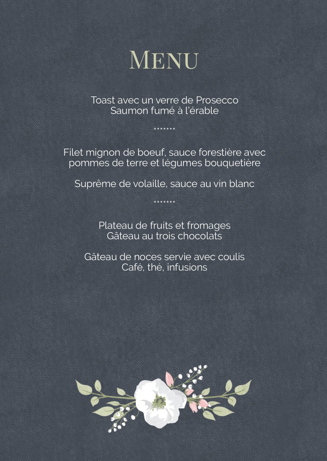 Cartons de menu pour mariages et fêtes