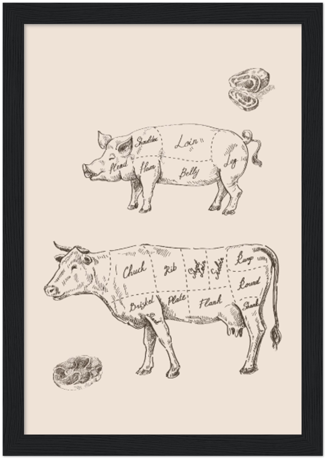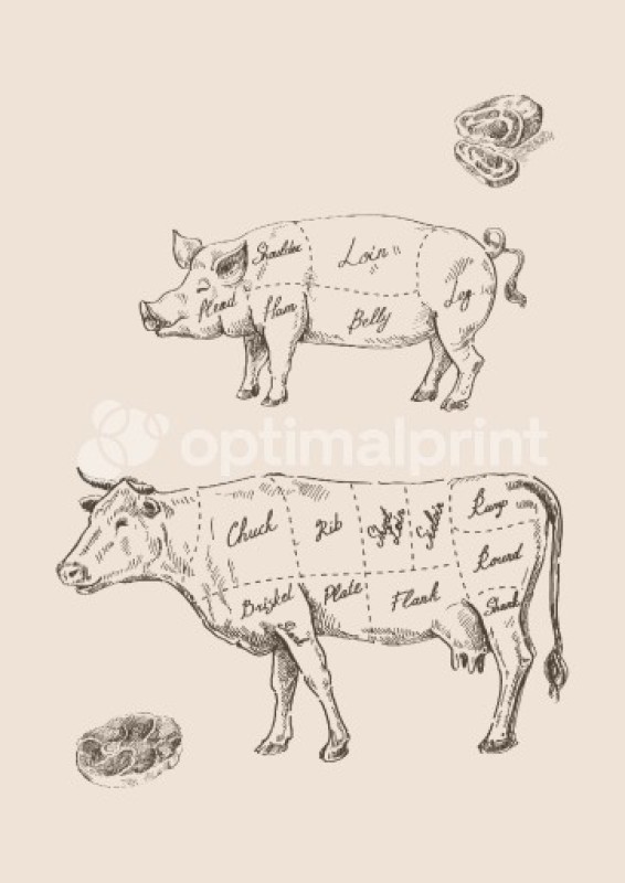 brun, vache, cuisine, cochon, porcin, ancien, animaux, typographique, art-print-animal-illustrations