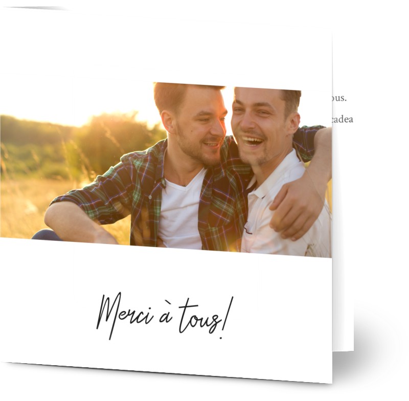 Le jour de votre mariage n'aurait pas été le même sans la participation et le soutien de vos amis et de votre famille. Envoyez-leur une carte de remerciement de mariage personnalisée. Personnalisez facilement vos cartes de remerciement de mariage pour qu'elles soient vraiment les vôtres. Ajoutez des photos et des textes à n'importe quelle page de la carte Optimalprint sans frais supplémentaires.
