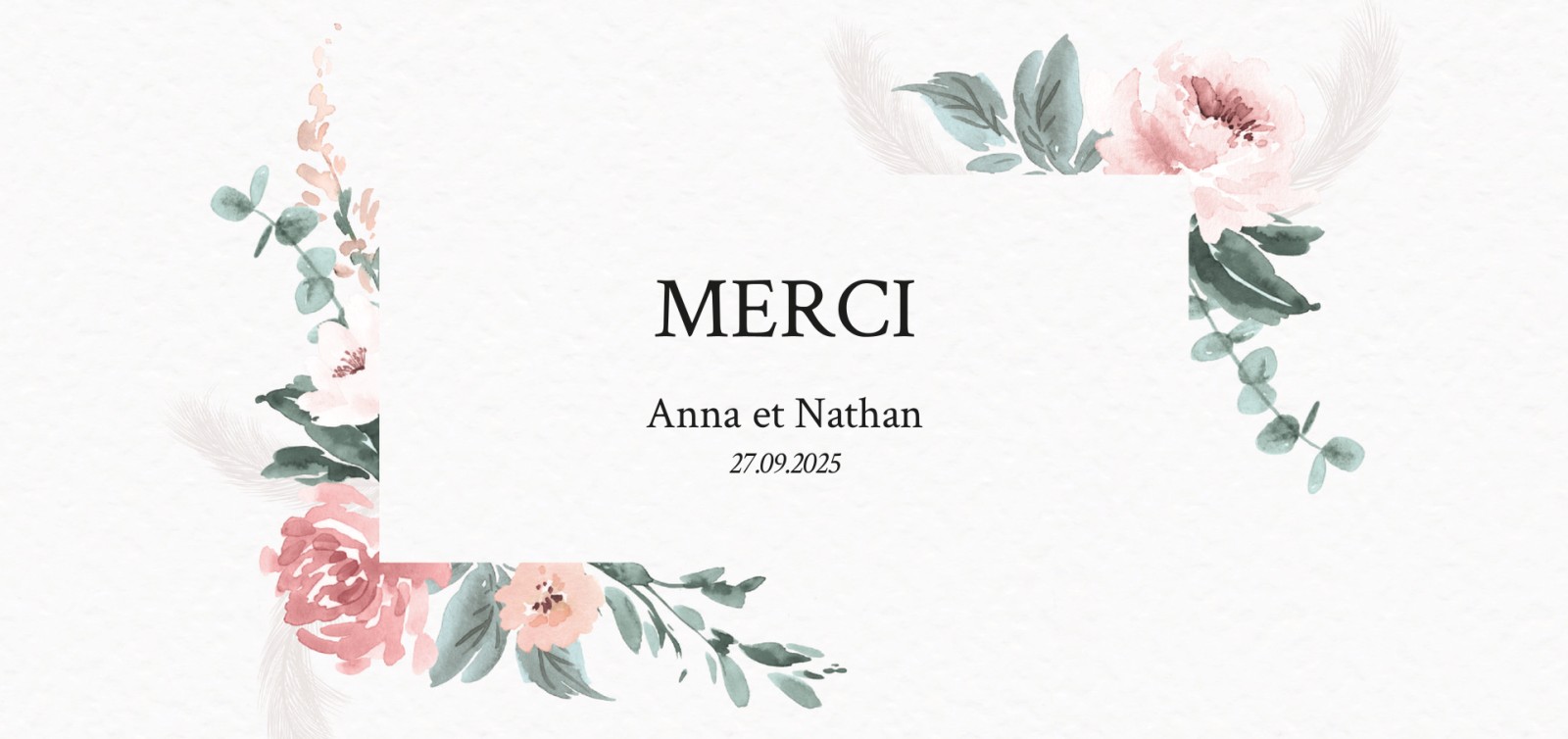 Le jour de votre mariage n'aurait pas été le même sans la participation et le soutien de vos amis et de votre famille. Envoyez-leur une carte de remerciement de mariage personnalisée. Personnalisez facilement vos cartes de remerciement de mariage pour qu'elles soient vraiment les vôtres. Ajoutez des photos et des textes à n'importe quelle page de la carte Optimalprint sans frais supplémentaires.