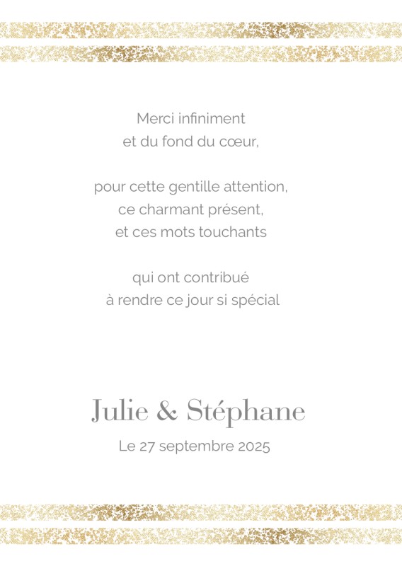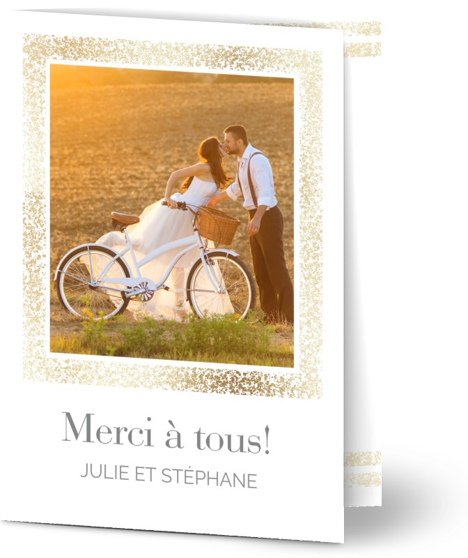 Le jour de votre mariage n'aurait pas été le même sans la participation et le soutien de vos amis et de votre famille. Envoyez-leur une carte de remerciement de mariage personnalisée. Personnalisez facilement vos cartes de remerciement de mariage pour qu'elles soient vraiment les vôtres. Ajoutez des photos et des textes à n'importe quelle page de la carte Optimalprint sans frais supplémentaires.