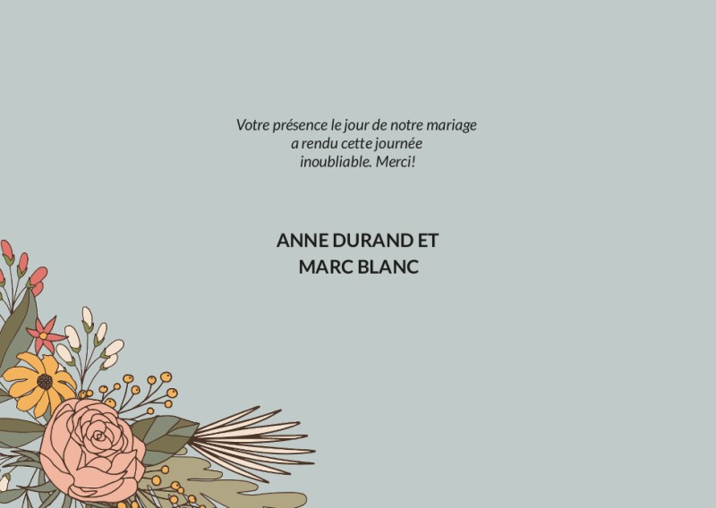 Le jour de votre mariage n'aurait pas été le même sans la participation et le soutien de vos amis et de votre famille. Envoyez-leur une carte de remerciement de mariage personnalisée. Personnalisez facilement vos cartes de remerciement de mariage pour qu'elles soient vraiment les vôtres. Ajoutez des photos et des textes à n'importe quelle page de la carte Optimalprint sans frais supplémentaires.