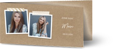 Une messe de confirmation est une étape importante dans la vie d'un enfant et une carte de remerciements de confirmation originale peut être votre manière de marquer cette occasion pour vos proches et vos êtres chers. Notre service professionnel de fabrication de faire-part de remerciement vous permet de créer votre propre carton de remerciement pour vos amis et votre famille, afin que la mémoire de cette journée spéciale perdure pour vous tous. Vous pouvez inclure votre photo préférée de l'événement et ajouter un message plein de sens pour vous afin de créer le cadeau parfait pour capter le souvenir de la cérémonie de confirmation. Les cartes de remerciements de confirmation feront également un cadeau parfait pour ceux qui n'auront pas pu venir, et vous pourrez en envoyer partout dans le monde aux membres de votre famille éloignés. Nous proposons un tel choix de modèles que vous pouvez créer votre carte très rapidement et facilement, quel que soit le style choisi. Allez-y, créez votre carte de remerciements de confirmation parfaite, exactement dans votre style avec Optimalprint France