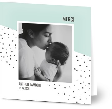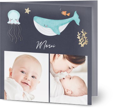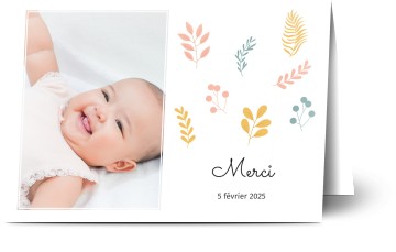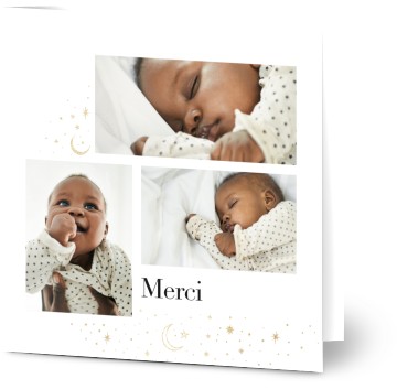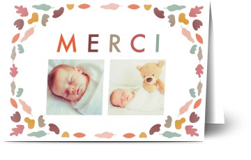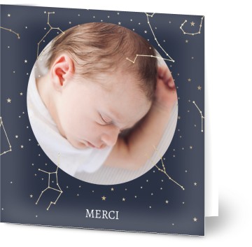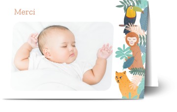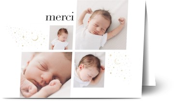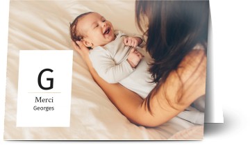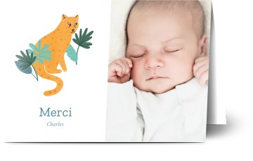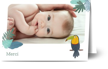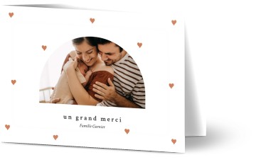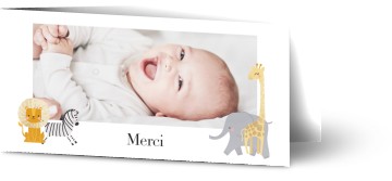Les cartes de remerciement de naissance offrent une excellente manière de remercier vos amis et vos proches pour leur soutien. Ils offrent une fantastique façon de communiquer une photo du nouvel arrivant et de remercier amis et famille pour les cadeaux et vœux de bonheur après la naissance du bébé. Vous pouvez ajouter des informations comme la date de naissance et le poids du bébé ainsi qu'un message personnel sans supplément de prix. Nos cartes de remerciement de naissance ont été conçues en pensant aux nouveaux parents. Nous avons facilité et accéléré le processus de téléchargement de photo et d'ajout de texte et nous nous chargeons du reste ! La création de vos propres faire-part de remerciement pour la naissance de votre bébé est amusante et facile et vous permet de faire savoir à quel point vous avez apprécié le temps, le soutien, les cadeaux et les bons vœux. Quel que soit le modèle de carte de remerciement de naissance que vous choisirez dans notre énorme collection, vous pourrez changer le texte et déplacer le contenu jusqu'à ce qu'il vous satisfasse pleinement. Vous pouvez ajouter des images, du texte ou déplacer la disposition. Nos cartes de remerciement de naissance avec photo sont entièrement personnalisables. Optimalprint vous suggère même du texte !